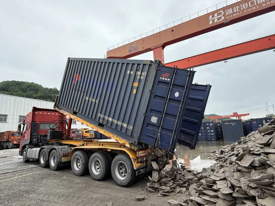 針對鎳鐵易撒漏、難抓取等難點(diǎn),技術(shù)團(tuán)隊將3噸抓斗升級為5噸大容量抓斗,并創(chuàng)新推行“裝載機(jī)艙內(nèi)裝箱+岸橋起坡上車+雙自卸車循環(huán)轉(zhuǎn)運(yùn)”流程。單箱凈重30噸,單循環(huán)時間壓縮至12分鐘,設(shè)備空轉(zhuǎn)與貨物損耗顯著減少。作業(yè)效率由60噸/小時躍升至150噸/小時,日均卸船能力突破2000噸。